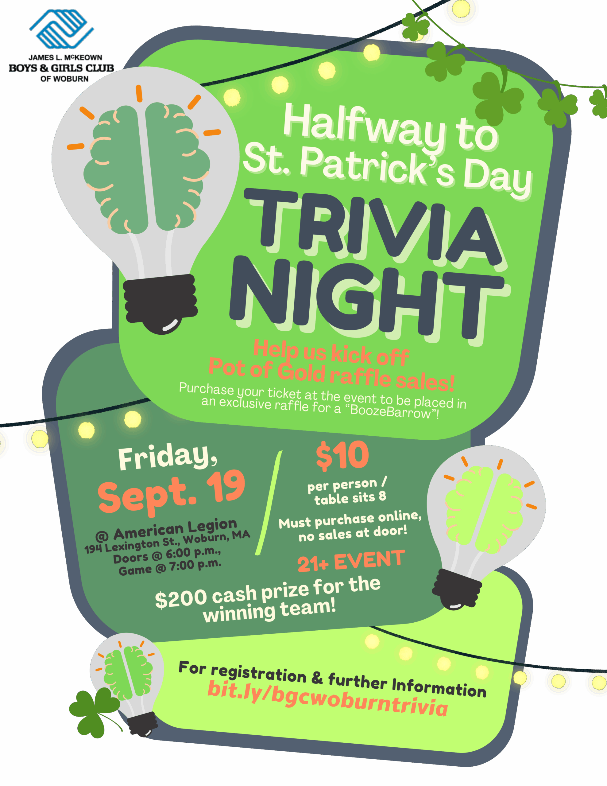 Join us for our annual Halfway to St. Patrick’s Day Trivia Night at the American Legion Hall in Woburn, Massachusetts. This will also be the launch of Pot of Gold raffle tickets for the 2025-2026 season!